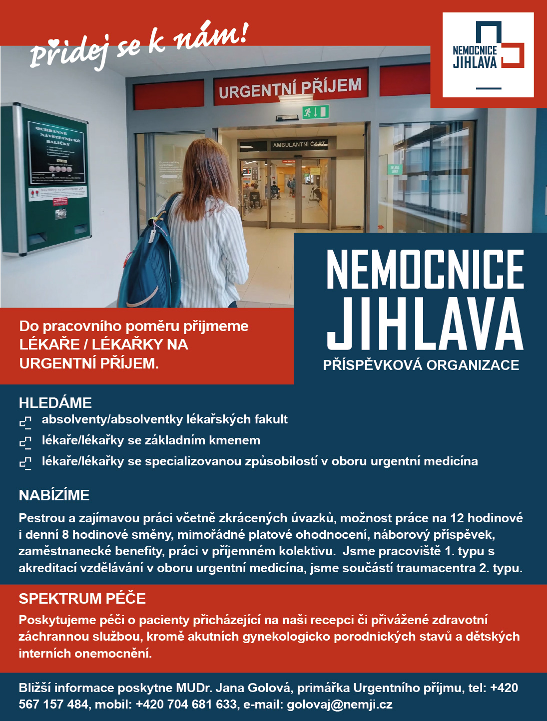 • NEMOCNICE JIHLAVA PŘÍJME LÉKAŘE DO CENTRA VYSOCE SPECIALIZOVANÉ TRAUMATOLOGICKÉ PÉČE PRO DOSPĚLÉ II. TYPU